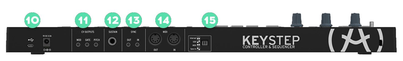14. MIDI-вхід/вихід Під’єднайте та синхронізуйте KeyStep з будь-яким DAW або апаратним MIDI-обладнанням