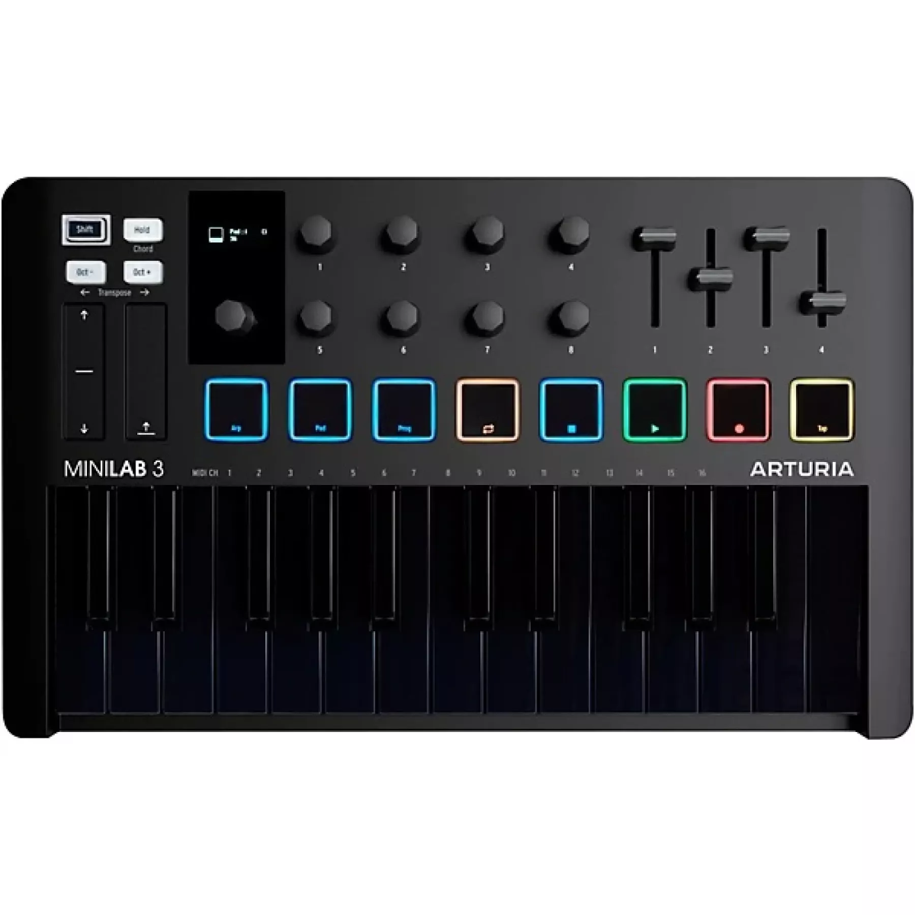 MiniLab 3 - це компактна MIDI-клавіатура та пед-контролер, який дозволяє користувачам створювати музику прямо з коробки. MiniLab 3 з творчим робочим процесом plug-and-play, універсальними елементами керування, що призначаються, 2000 підібраними звуками з величезної бібліотеки Analog Lab і комплектом програмного забезпечення для творчості світового класу, покликана нарешті допомогти новачкам і професіоналам повністю поринути в музику. творчий потік, незалежно від їхнього стилю.