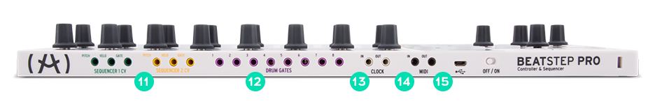 15-USB USB-порт дозволяє підключатися до комп'ютера, від якого здійснюється живлення і синхронізація з різними програмними продуктами. Щоб використовувати BeatStep Pro в якості самостійного пристрою, необхідно скористатися мережевим USB-адаптером живлення.