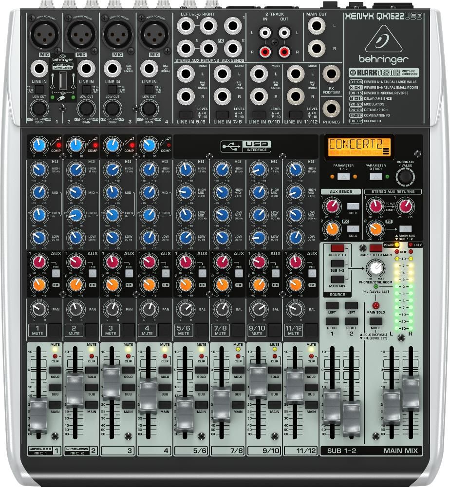 Крім 4 основних мікрофонних входів є можливість придбати до мікшера wireless адаптер і під'єднати два бездротових мікрофони. Як і інші мікшерні пульти Behringer, XENYX QX1622USB сумісний з конденсаторними і динамічними мікрофонами завдяки наявності фантомного живлення, яке можна відключити. Для забезпечення широкого динамічного діапазону мікрофонні входи мають власні передпідсилювачі, а щоб уникнути паразитарних шумів, у мікшері встановлено фільтри низьких частот.