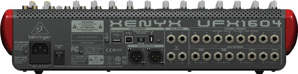 Маючи розкішний набір характеристик, що включають першокласні мікрофонні попередні підсилювачі XENYX, компресори з функцією "одного регулятора, британські еквалайзери і вбудовані 24-бітні ефекти, новий BEHRINGER UFX1604 є одним з компактних мікшерів, що забезпечують найкраще звучання, яке ви коли-небудь чули. UFX1604 залишив на багато світлових років позаду середньостатистичні мікшери завдяки вбудованому USB/FireWire інтерфейсу з 16 х 4 входами/виходами і 16-трековому USB-рекордеру. Уявіть, що ви можете записати ваш наступний живий виступ прямо на носій USB-пам'яті або навіть безпосередньо на ПК/Macintosh, а секція передачі даних UFX1604 може функціонувати як дистанційний центр управління для програмного забезпечення цифрової робочої станції на комп'ютері за допомогою MIDI.