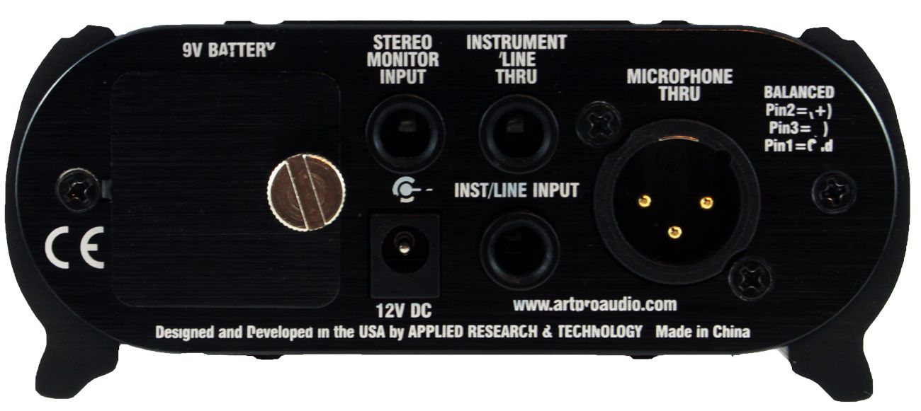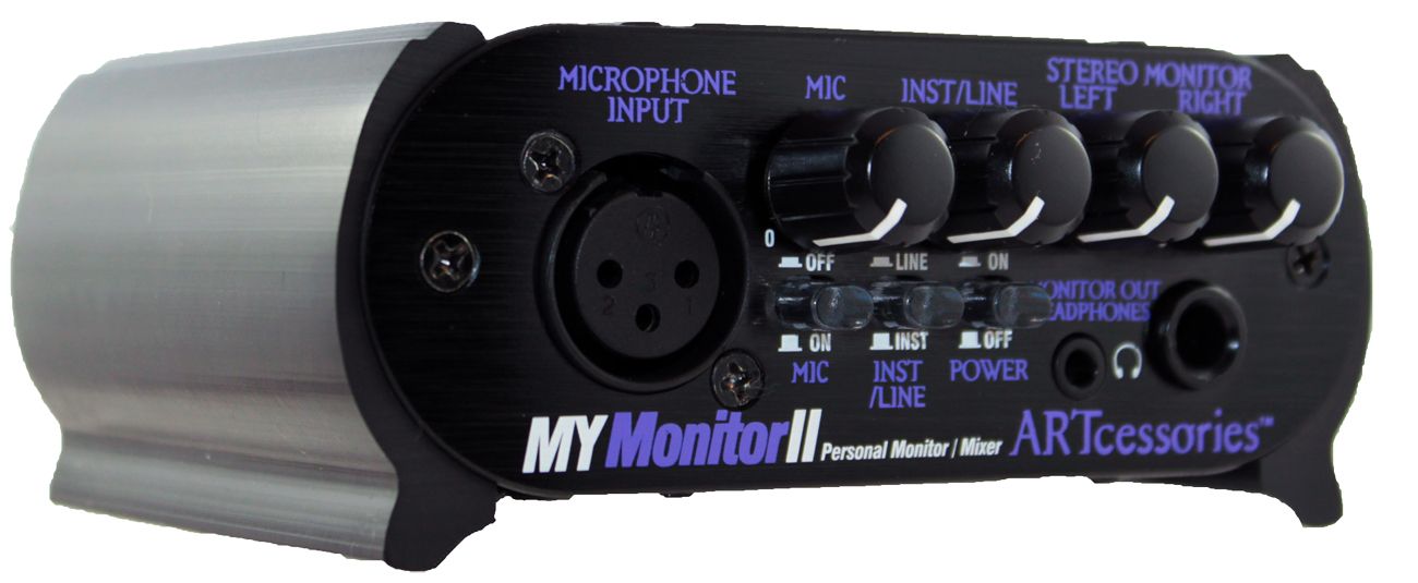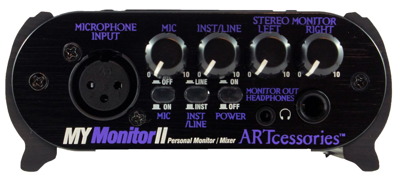 ART Mymonitor II - Персональний моніторний мікшер, monitor input, instrument/line in, mic thru, stereo monitor input, виходи на навушники TRS 1/4 і 1/8, живлення від блоку живлення 12В або однієї батареї 9В.