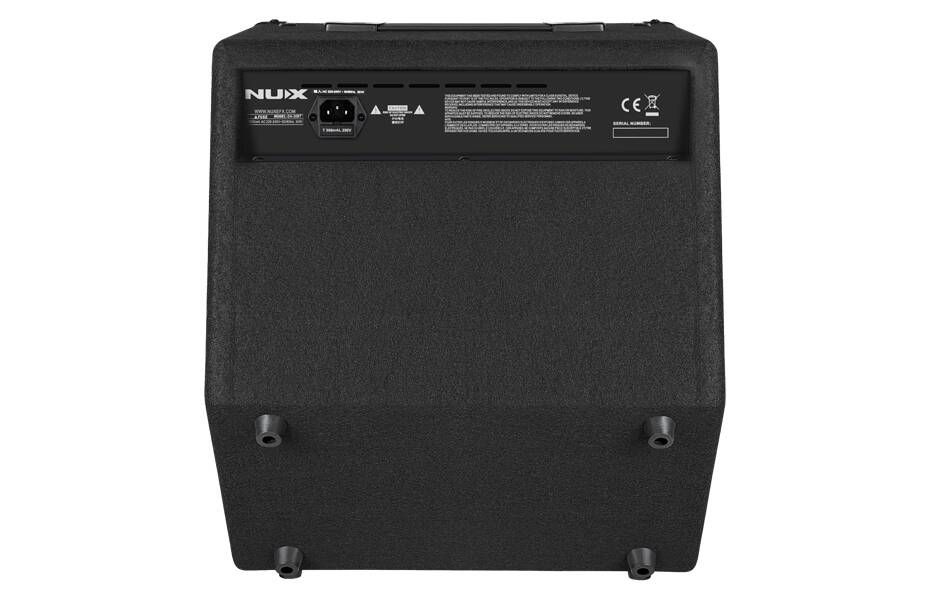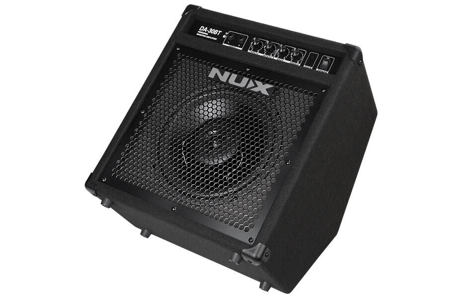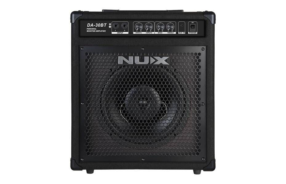 NUX DA 30BT - 2-канальний монітор для барабанщиків, що дає змогу під'єднувати не лише електронні ударні установки, а й будь-які інші музичні інструменти, які мають лінійний вихідний рівень, наприклад, клавіші та синтезатори. Озвучує аудіосигнал коаксіальний широкосмуговий динамік, що складається з 10-дюймового вуфера і 1-дюймового твітера, які розміщуються один на одному. Це дає змогу знизити кількість фазових спотворень, що призводить до більш чистого і природного звучання. Вбудований підсилювач забезпечує вихідну потужність 30 Вт. 2 вхідні канали представлені роз'ємами 1/4" Jack TS і оснащені незалежними регуляторами гучності. Кожен з них має вхідний опір 68 ком, що дає можливість працювати з лінійними сигналами, але не підходить для мікрофонних та інструментальних. Для корекції загального звучання є 2-смуговий еквалайзер з діапазоном роботи +/- 15 дБ для частот в області 60 Гц і 10 кГц. Для підключення зовнішнього джерела звуку є вхід AUX, зроблений на роз'ємі 1/8" Jack TRS. Передавати аудіо можна і через Bluetooth з мобільного пристрою. Корпус має скошену задню стінку, що дає змогу мати монітор під кутом для найбільш вдалої точки прослуховування. Живлення здійснюється від мережі. На верхній частині конструкції є зручна ручка для перенесення пристрою.