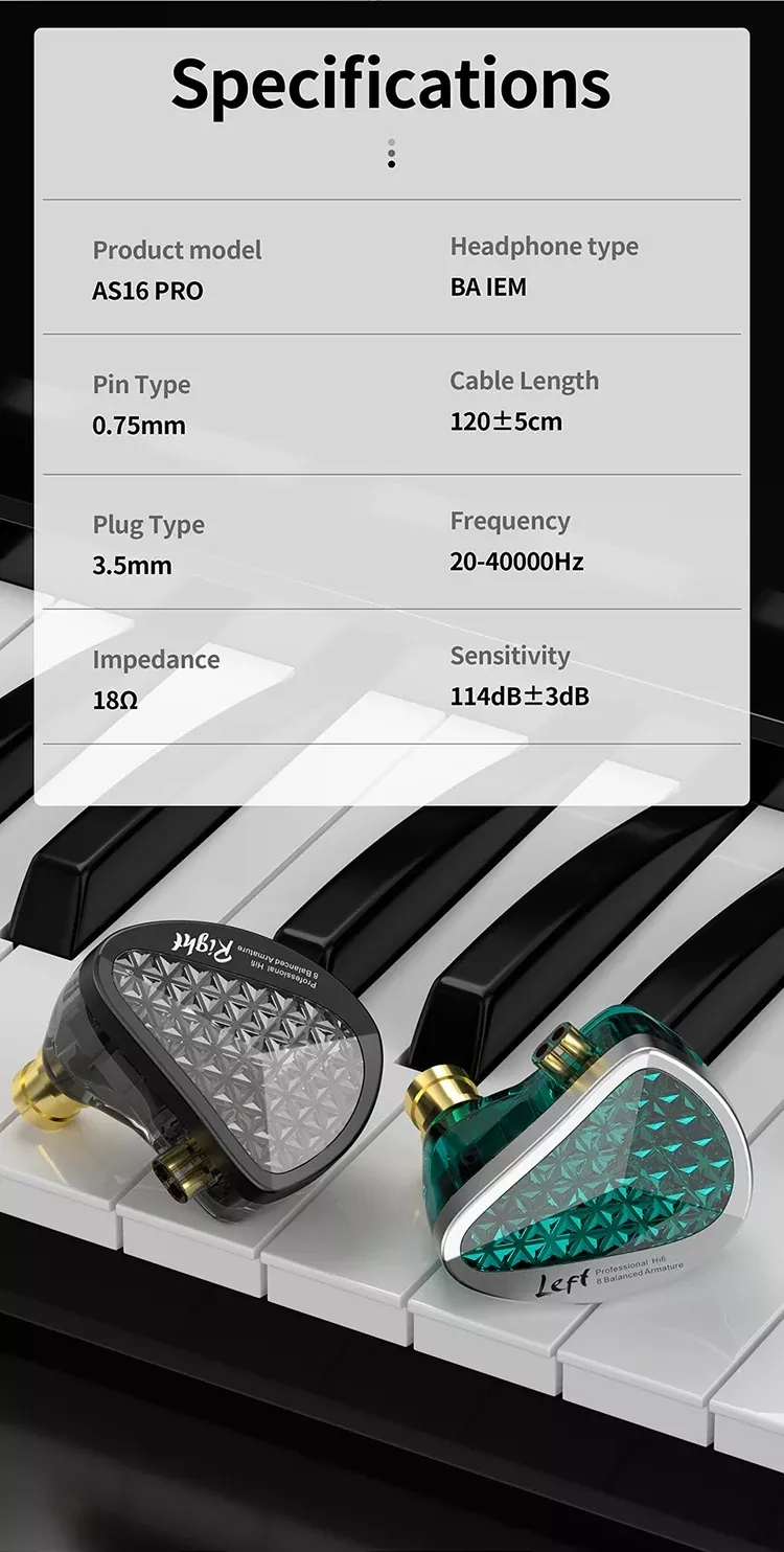 AS16 PRO має досить низький опір і високу чутливість, що є відмінною особливістю арматурних драйверів. Це дозволяє використовувати навушники не лише з дорогими аудіо картами, але й зі слабкими підсилювачами смартфонів та плеєрів. Запас гучності буде достатньо на будь-якому типі пристроїв.
