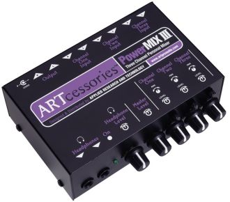 ART Power MIX III - трьохканальний мікшер з підсилювачем для навушників, 3 вхідні канали, регулювання панорами, вхідного і вихідного рівня, 6 входів, 2 виходи на навушники, зовнішній блок живлення 220V/12V (в комплекті), індикація перевантаження на каналі, габарити 143x92x45 мм, вага: 0,6 кг. Компактний, простий і надійний мікшерний пульт, оснащений шістьма монофонічними входами, згрупованими в три стереопари, і з одним балансним стереовиходом.
