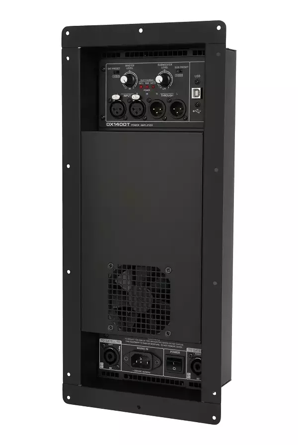 DX1400T DSP - професійний, вбудований трьохканальний комбінований підсилювач (модуль) класу D з вбудованним DSP-процесором, призначений для конфігурації: сабвуфер+два сателіти. Всі елементи модуля змонтовані на одній несучій панелі і розміщені в кожусі, що виконує захисні функції і забезпечує поглиблену посадку підсилювача в корпус акустичної системи.