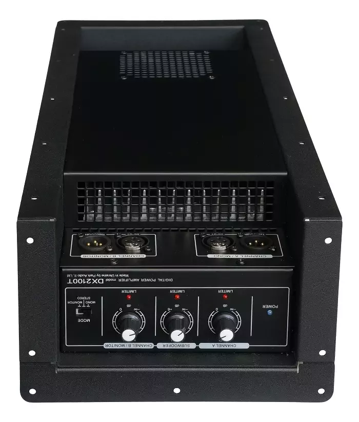 DX2100T - професійний, вбудований трьохканальний комбінований підсилювач (модуль) класу D, призначений для конфігурації: сабвуфер+два сателіти. Всі елементи модуля змонтовані на Г-образної конструкції з двох несучих панелей і закриті з тильного боку кожухом, який виконує захисні функції і забезпечує поглиблену посадку модуля в корпус акустичної системи.