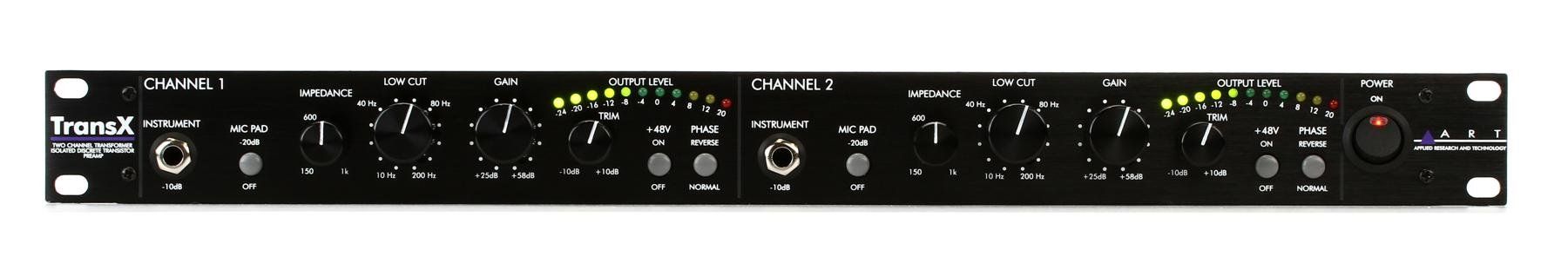 ART TransX є двоканальним мікрофонним передпідсилювачем розміром 1U, призначеним для максимум 68 дБ посилення чистого сигналу для музикантів, вокалістів і звукоінженерів у живих театральних постановках і домашніх, проектних і комерційних студіях звукозапису.