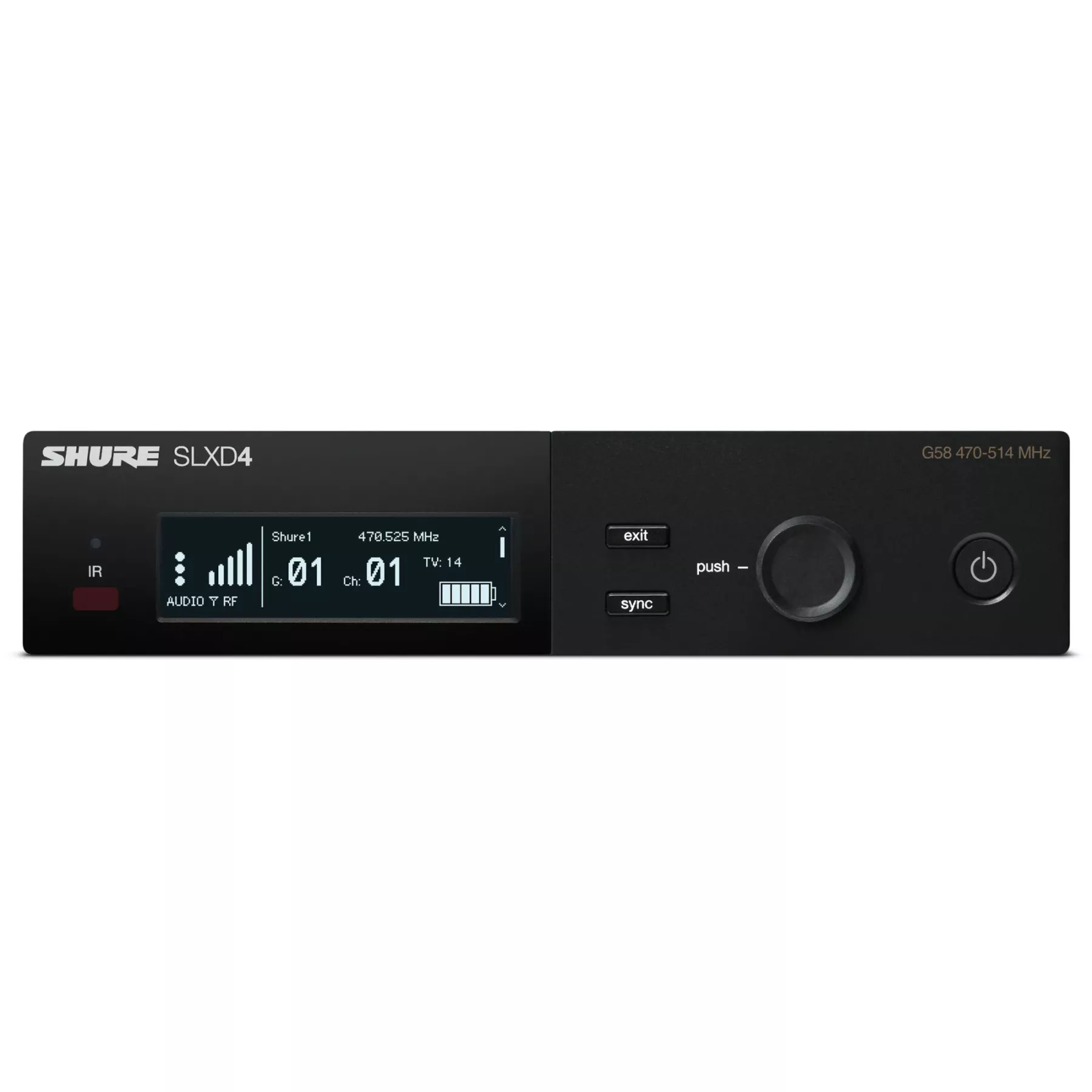 Цілометалевий стійковий приймач SLXD4 оснащений зрозумілим РК-екраном. Є можливість регулювання посилення, а також мікрофонний/лінійний XLR та 1/4" інструментальний вихід. Додаткові функції включають автоматичне сканування частоти та ІЧ-синхронізацію, що дозволяє легко налаштувати передавач і приймач на ту саму частоту. Налаштування декількох систем здійснюється швидко та просто завдяки порту Ethernet, який дозволяє виконувати координоване сканування частоти для всіх підключених приймачів з одного місця.