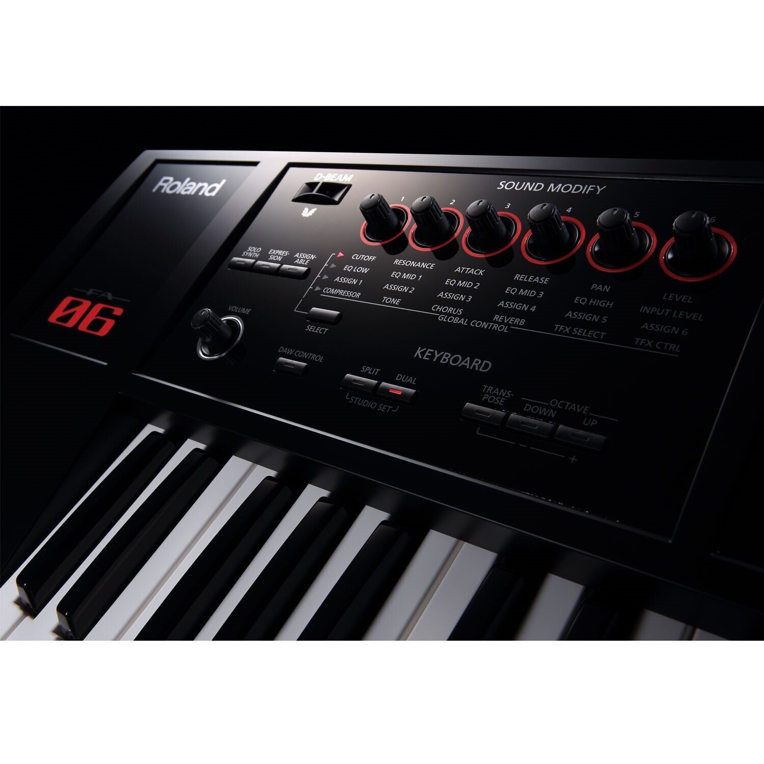 Корпус Roland FA-06 повністю виготовлений із пластику, завдяки чому вага становить лише 5,7 кг. Для 61-клавішного інструмента габарити синтезатора порівняно невеликі - 100 х 30 х 10 см. До речі, аналогічні розміри мають і 61-клавішні синтезатори JUNO.