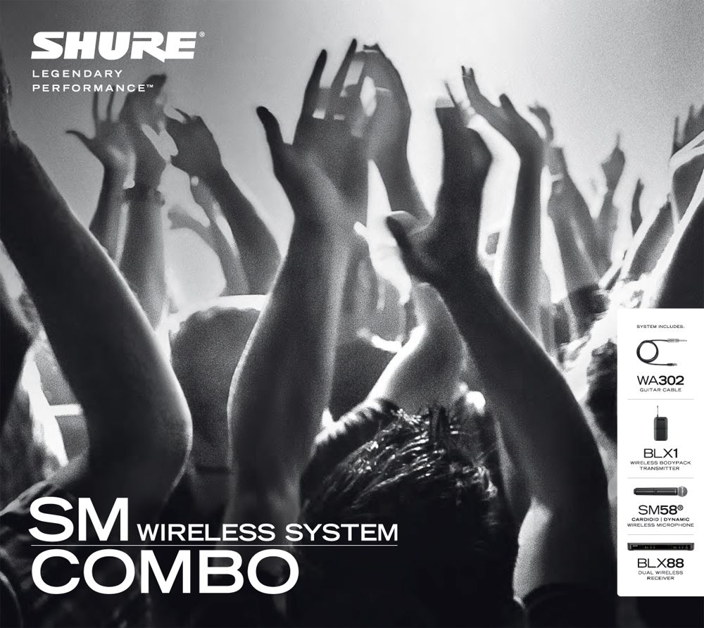 Комплект: двоканальний приймач BLX88, поясний передавач BLX1, гітарний кабель WA302, ручний мікрофон SM58 з передавачем BLX2, блок живлення, 4 AA батарейки, міцний м'який чохол на блискавці, інструкція.