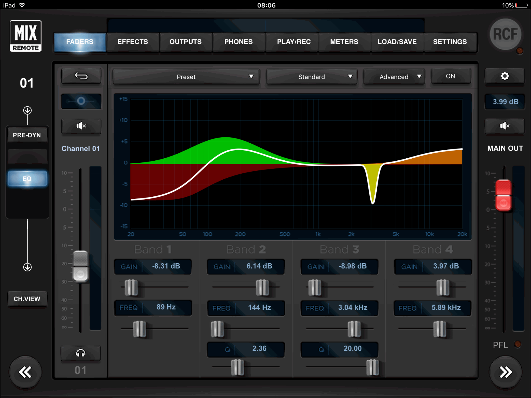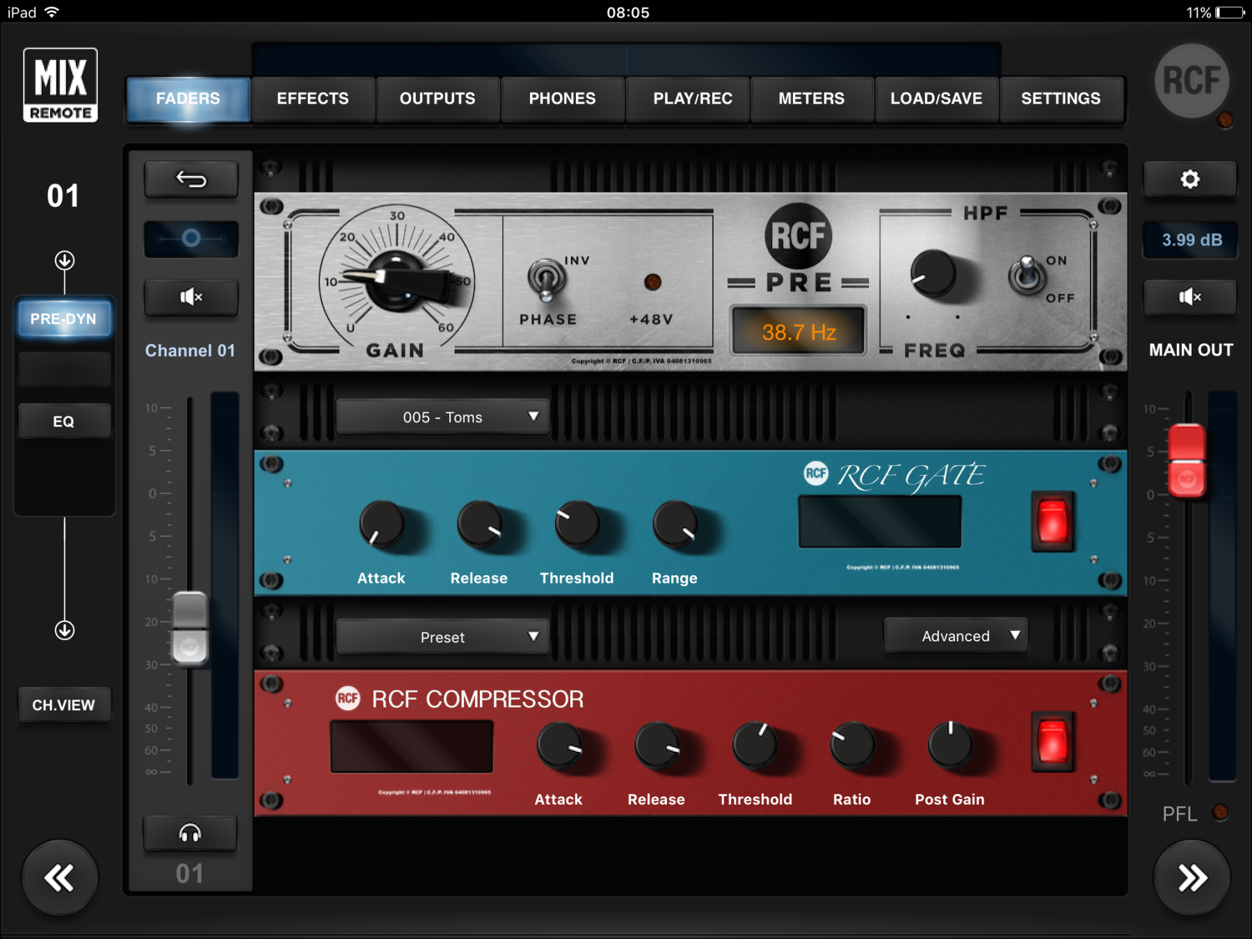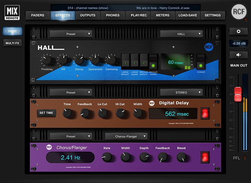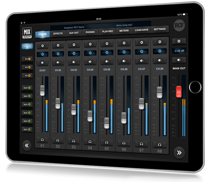 Для управління мікшером передбачено спеціальний мобільний додаток RCF MixRemote. Примітно, що цей додаток працює не тільки на iOS пристроях, але також доступний і для пристроїв на Android. Завантажити і встановити MixRemote можна безкоштовно в магазинах App Store і Google Play. Керування мікшером здійснюється виключно з екрана пристрою, проте можна підключити педаль і MIDI-контролер для додаткового управління деякими параметрами.