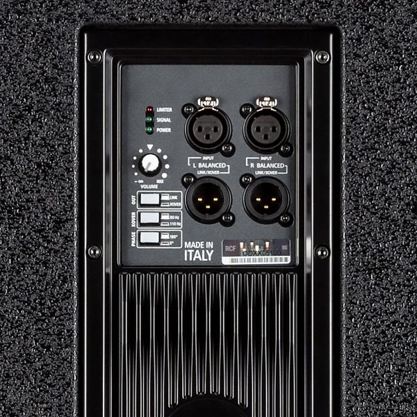 Підсилювачі потужності RCF класу D забезпечують високу ефективність АС. Підсилювачі лінійки SUB забезпечують швидку атаку, реалістичну перехідну характеристику і високу якість відтворення аудіо. Підсилювач оснащений міцним алюмінієвим корпусом, що забезпечує надійне транспортування і безвентиляторне відведення тепла. Наявність блоку живлення з технологією SMPS забезпечує максимальну вихідну потужність за мінімальної ваги колонки.