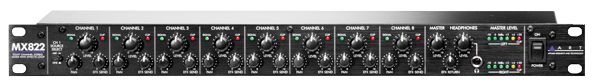 ART MX822 - Рековий мікшер, 1 мікрофонний (+48В) і 8 стерео вхідних каналів (TRS1/4"), майстер вихід XLR (L&R), стерео TRS 1/4", окрема стерео петля ефектів, розмір 1U.