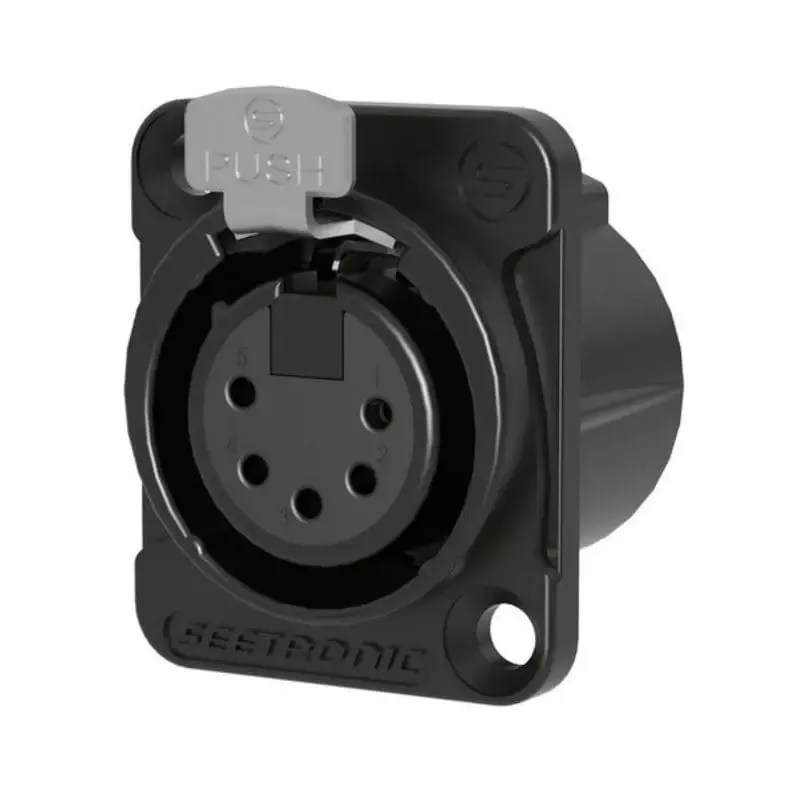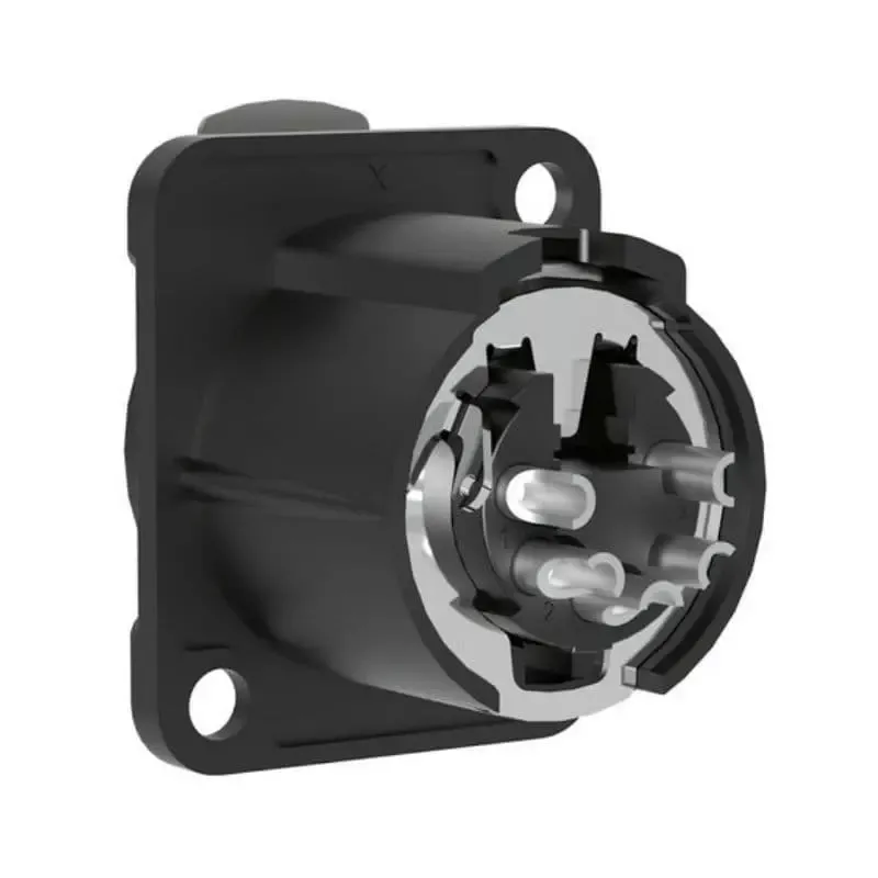 5-контактний роз’єм в корпусіі XLR із литим під тиском корпусом із цинкового сплаву, чорною оболонкою та посрібленими контактами D-форма металевої оболонки з інсталяційними розмірами D-типу промислового стандарту забезпечує сумісність встановлення Монтаж з передньої або задньої частини панелі Короткий осьовий розмір, економія місця та мала вага