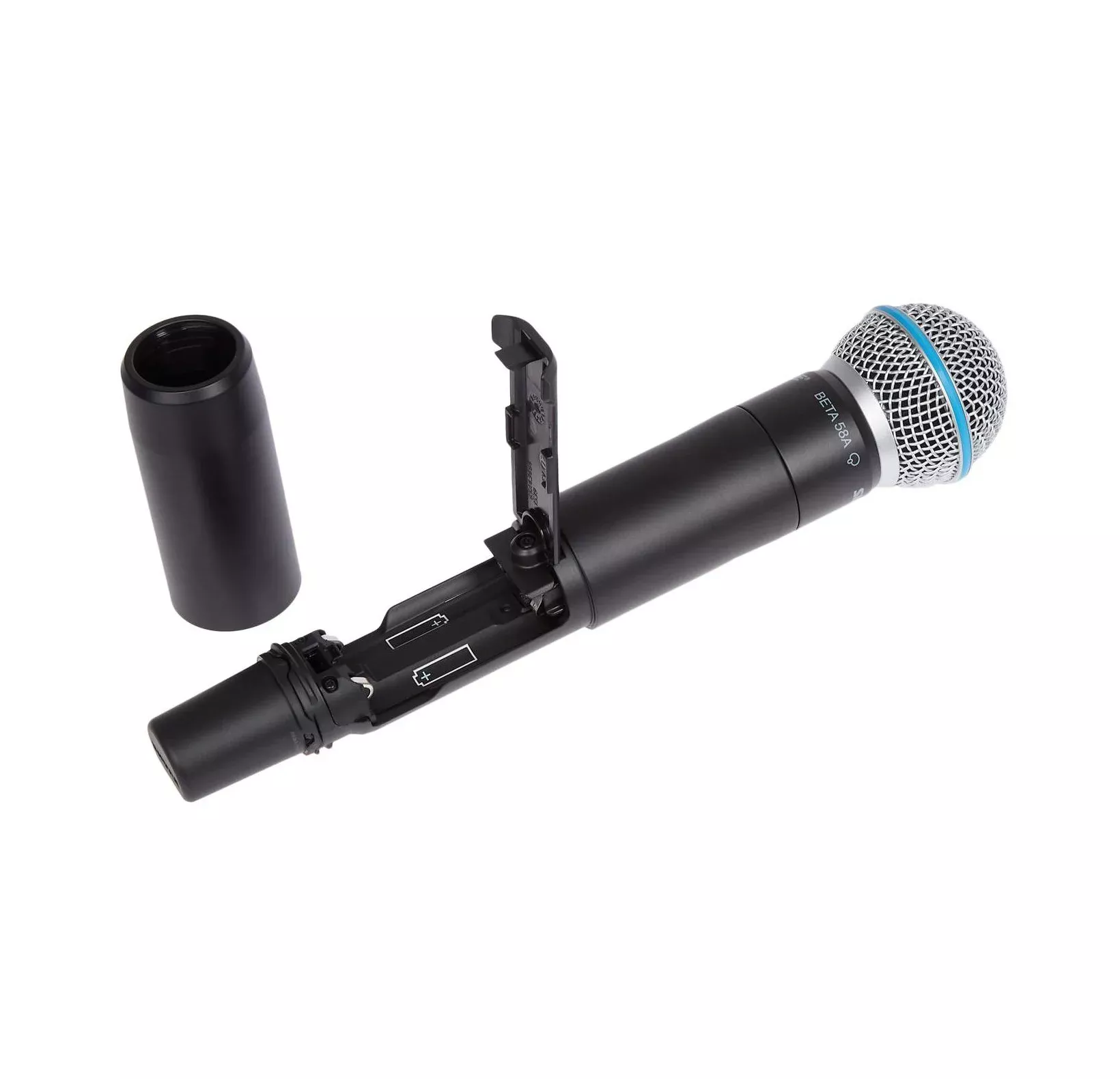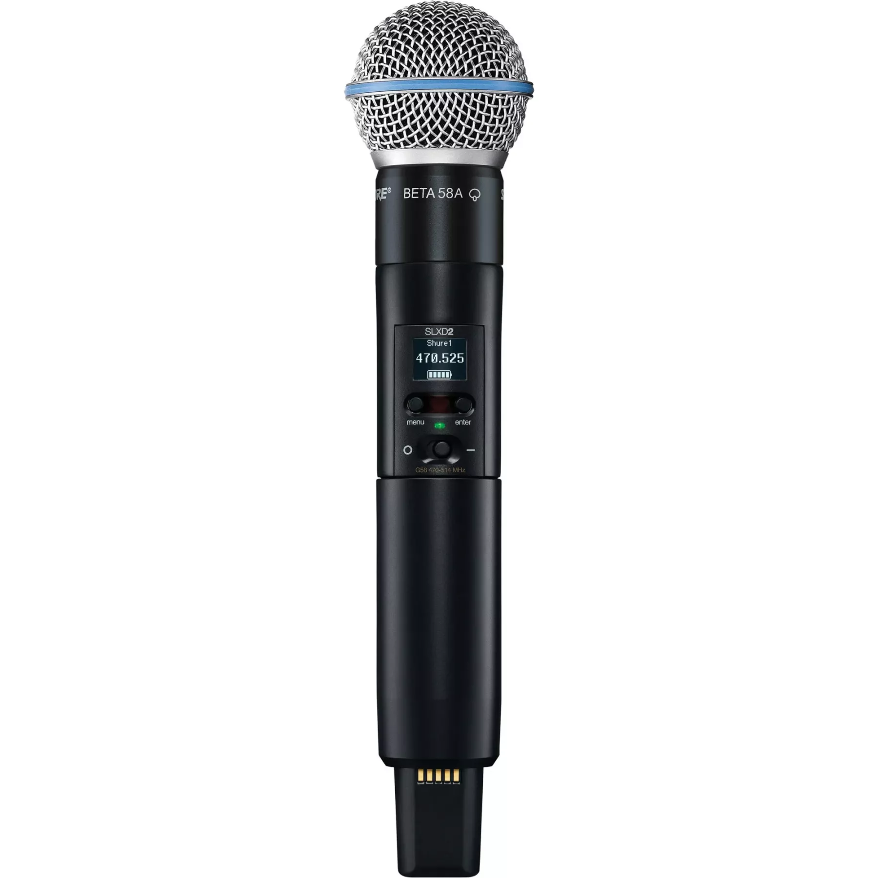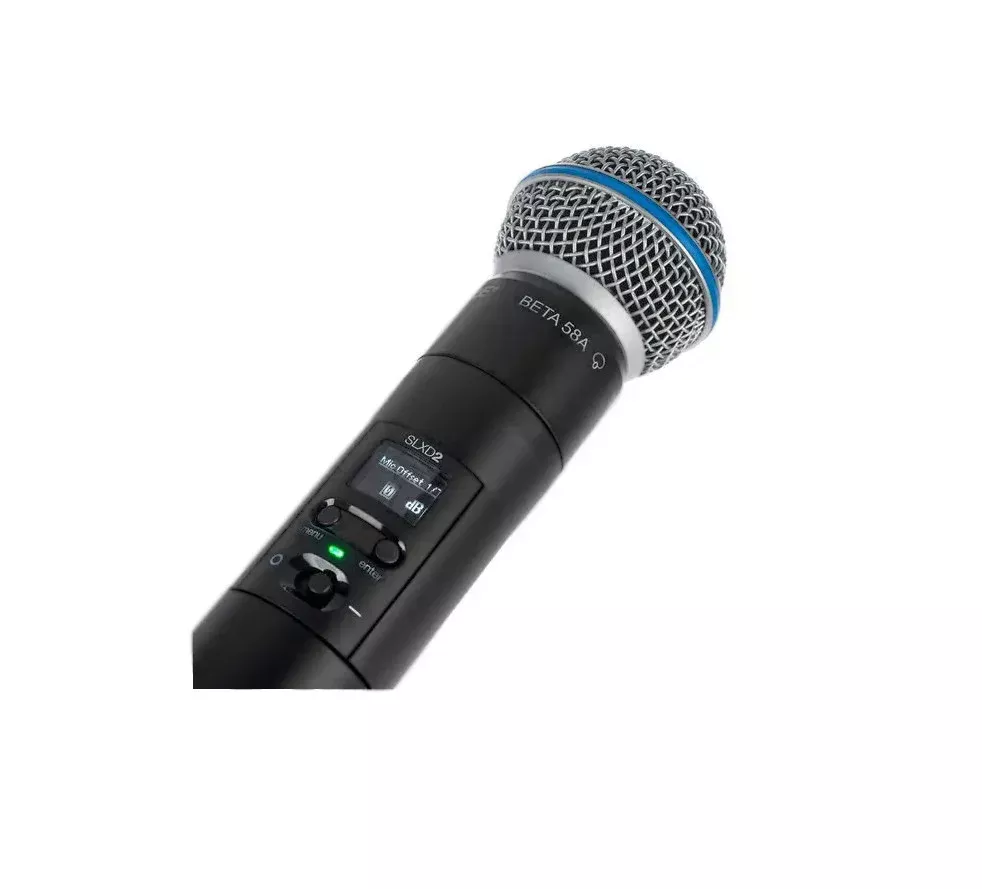 Shure SLXD2/B58-H56 – це цифровий ручний бездротовий мікрофонний передавач, сумісний з приймачами SLX-D, який працює в діапазоні частот 518 - 562 МГц. Він оснащений динамічним капсулем Beta 58A, призначеним для вокалу з близької відстані, з посиленням середніх частот та відхиленням низьких частот для контролю ефекту наближення. Капсуль має суперкардіоїдну полярну діаграму спрямованості, що забезпечує високий рівень посилення до появи зворотного зв'язку, максимальну ізоляцію від інших джерел звуку та мінімальне забарвлення позаосьового тону. Дальність передачі становить понад 100 метрів. Передавач забезпечує до 8 годин роботи від двох батарей типу АА або батареї, що перезаряджається, SB903. Ручний передавач SLXD2/B58-H56 забезпечує чисту, 24-бітову якість цифрового звуку та надійну радіочастотну передачу в легкому, але міцному алюмінієвому корпусі. Він добре підходить для використання в малих та середніх концертних залах та молитовних будинках.