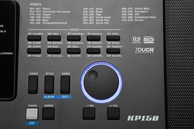 Розміщений у привабливому синтезаторному корпусі, KP150 постачається в комплекті зі знімною підставкою для нот і вбудованою стереозвуковою системою з 4 динаміками.