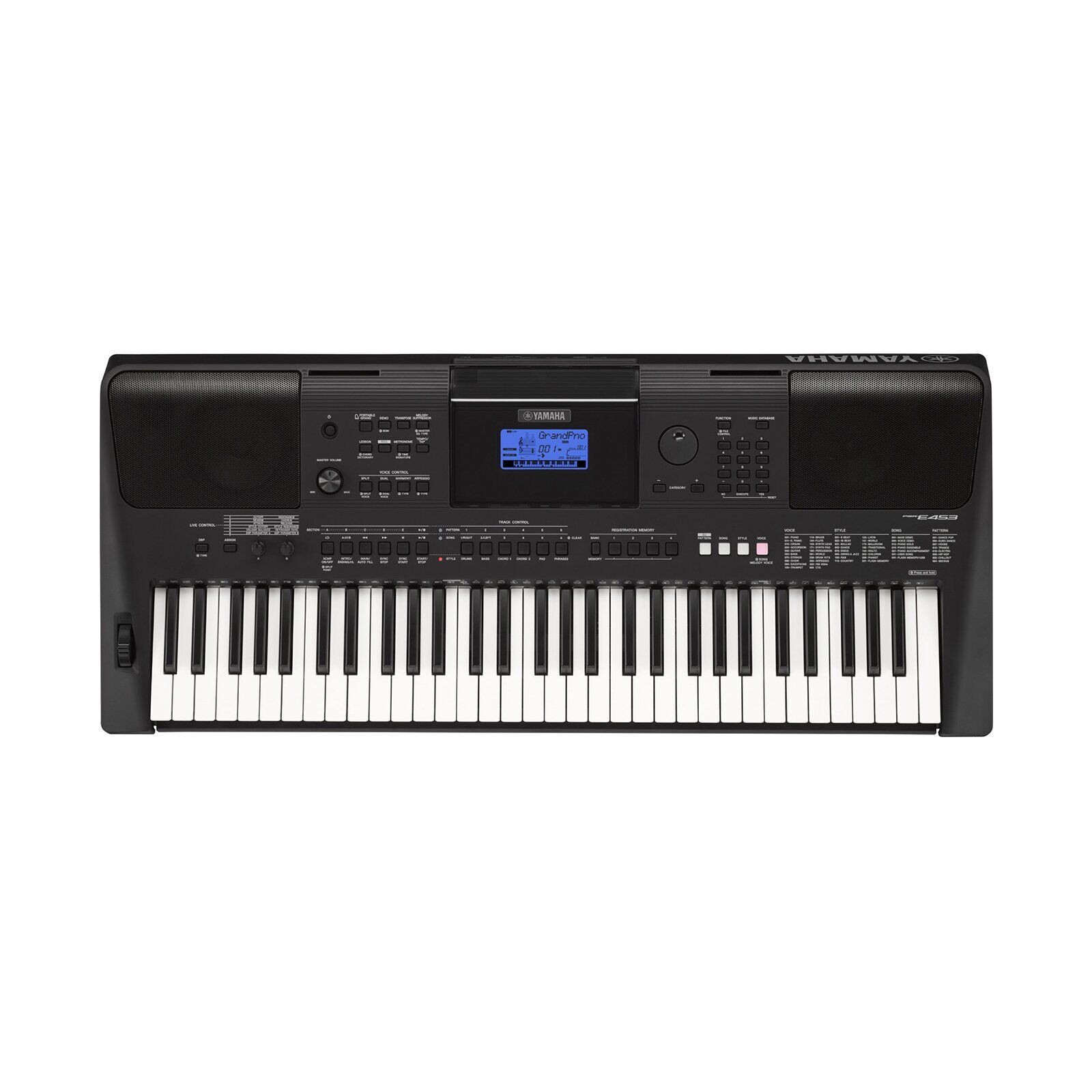 Yamaha PSR-E453 - компактний синтезатор, оснащений повнорозмірною динамічною клавіатурою на 61 клавішу, потужною вбудованою акустичною системою і професійними функціями, як-от: призначувані енкодери Live Control, режим DJ pattern і можливість під'єднання USB флеш-накопичувача.