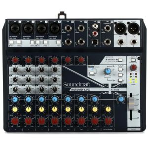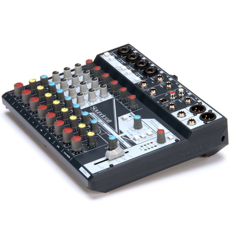 Як вхідні канали мікшер запропонує 4 комбіновані канали на роз'ємах XLR/TRS, 4 лінійні канали на роз'ємах 6,35 мм TS Jack і стереопару роз'ємів RCA для підключення побутових джерел. Два останні лінійні канали призначені для зовнішнього процесора ефектів. Роботі Soundcraft Notepad-12FX допомагають чотири високоякісні передпідсилювачі. Комбіновані вхідні канали допускають під'єднання, зокрема, й інструментів (до перших двох каналів), і конденсаторних мікрофонів, яким потрібне фантомне живлення +48В (перемикається). Можливість підключення найрізноманітніших інструментів потішить музичні гурти. Інтегрований USB-аудіоінтерфейс з роз'ємом USB-B на фронтальній панелі чудово підійде для запису виступів або домашнього перфомансу. Додатковим плюсом стане трьохсмуговий еквалайзер на перших чотирьох каналах і набір ефектів студійної якості від Lexicon, що містить регульовані ділей, реверберацію і хорус. Виходи представлені майстер-виходом на XLR, стереофонічним балансним роз'ємом для навушників 6,35 мм TRS Jack і додатковим балансним виходом AUX на такому ж роз'ємі. AUX/FX регулюється окремою ручкою на кожному каналі (включаючи три стереопари), а також додатковим майстер-регулятором. Канальні регулювання містять ручки регулювання паннінгу і балансу, а також рівня звуку. За рівнем звуку також допоможе стежити двоканальна шкала VU-метра.
