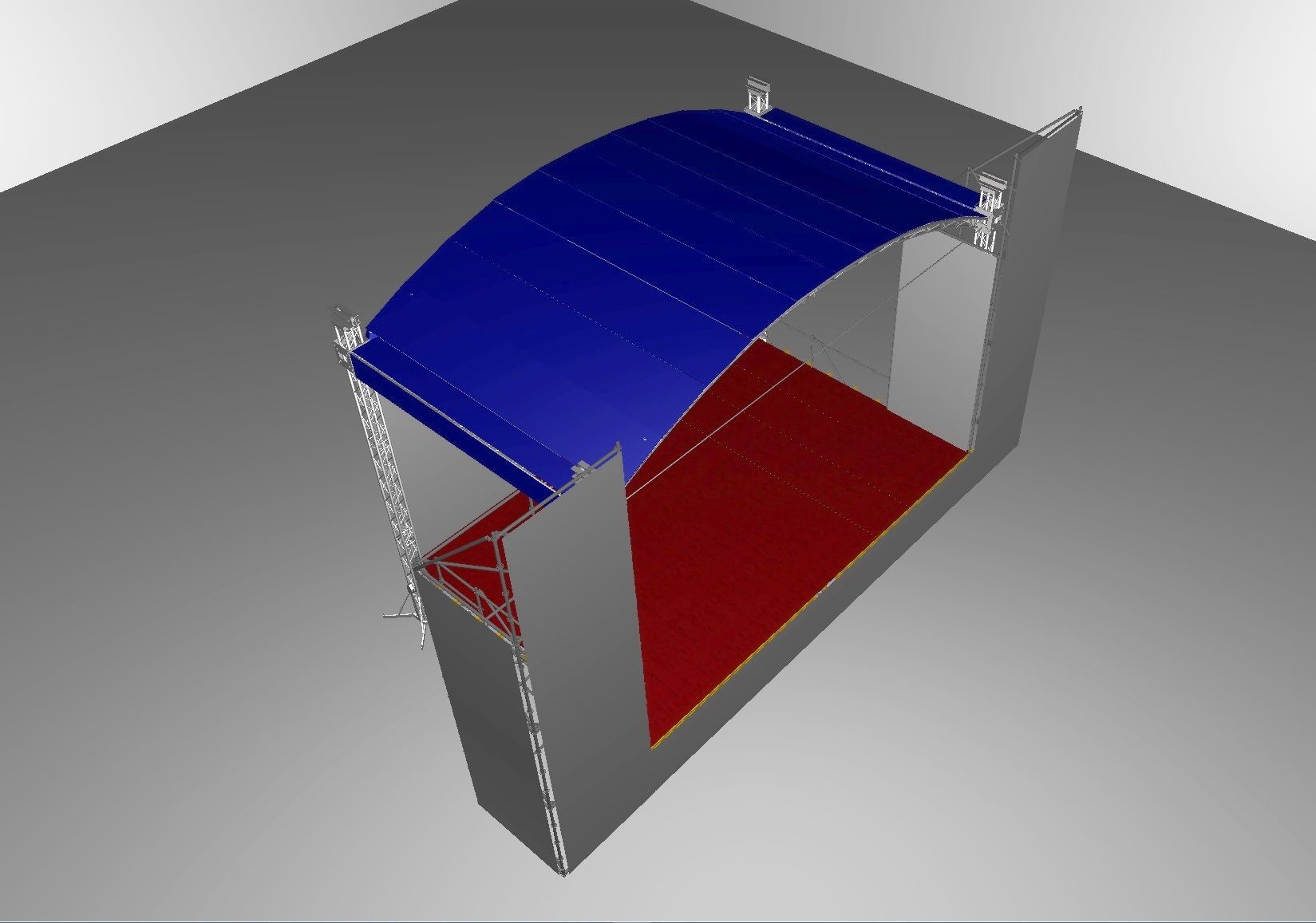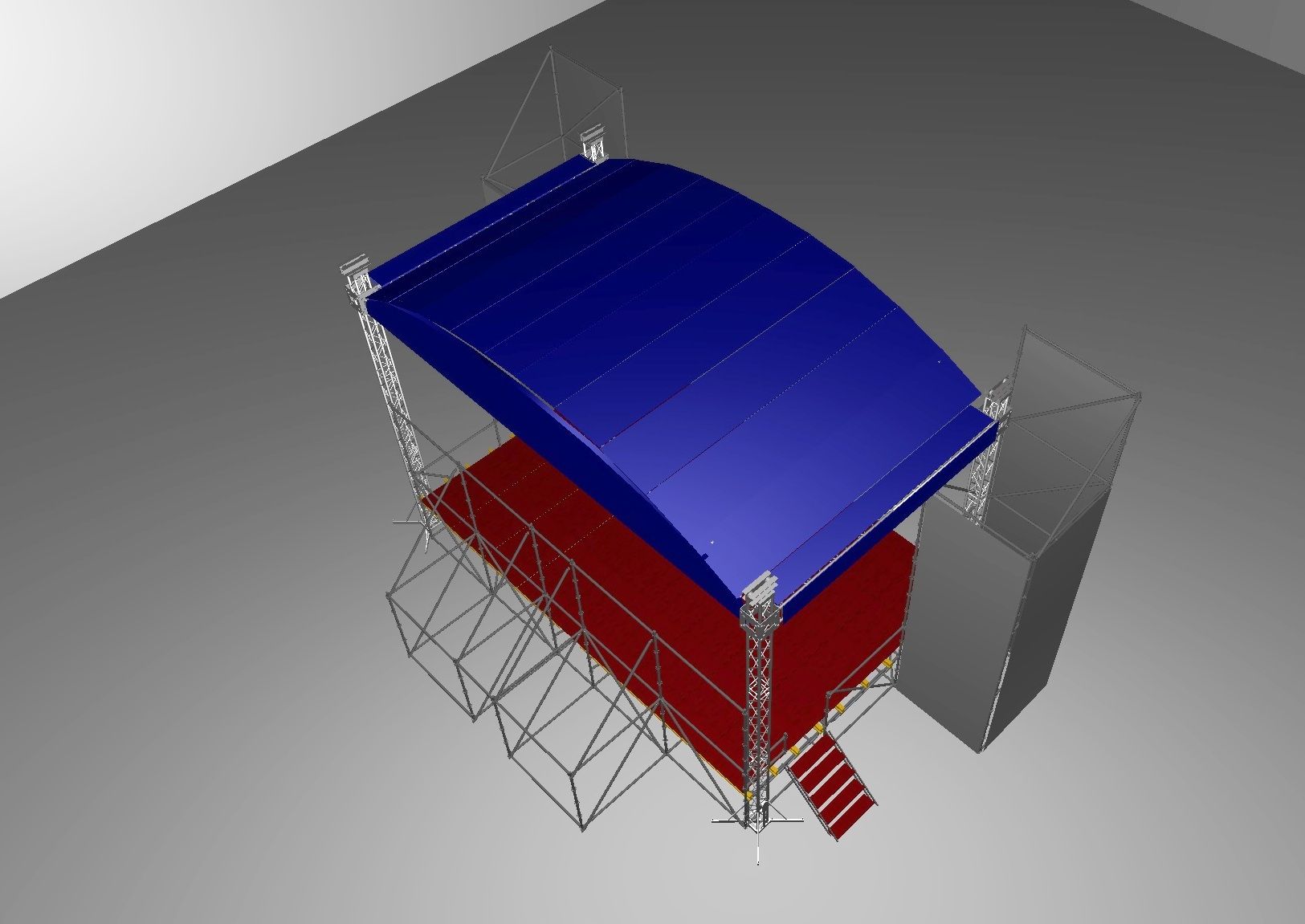 Портальні вежі для звукового обладнання, як і подіум, виготовлені зі стандартного будівельного риштування з кроком 2,07м.