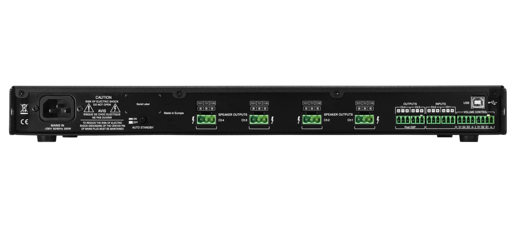TA804DL оснащений двома симетричними моно входами та двома пост-DSP лінійними виходами (канали 3 і 4), а також чотирма портами для дистанційного регулювання гучності. Всі з’єднання виконані на роз'ємах Euroblock.