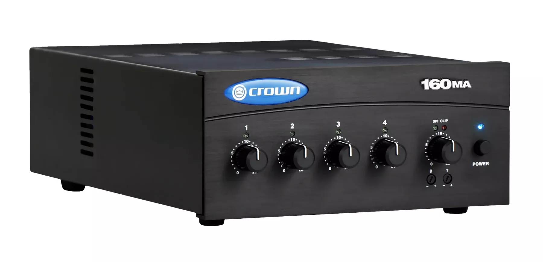 Crown 160MA - надійний мікшер-підсилювач для систем оповіщення та озвучування. Типові сфери застосування – фонова музика, оголошення та екстрене сповіщення у школах, лікарнях, ресторанах, торгових центрах, спортивних спорудах, офісах, лекційних залах, храмах, на виробничих об'єктах.