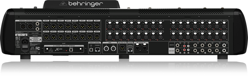 BEHRINGER X32 - 32-канальний цифровий мікшерний пульт з 32-бітовим DSP, 25 моторизованими фейдерами, програмованими мікрофонними передпідсилювачами класу high-end, 16 мікшуючими шинами, 32 XLR-входами, 16 XLR-виходами, 3-канальною (LCR) основною вихідною шиною, 6 додатковими лінійними входами/виходами, 2 виходами для навушників, секцією зворотного зв'язку (talk back), 2 портами для ULTRANET-з'єднання KLARK TEKNIK SuperMAC, портом для Firewire / USB / ADAT-карти розширення з 16-трековим USB-рекордером, 8 мультиефектпроцесорами, 7-дюймовим кольоровим TFT-дисплеєм, цифровими входом і виходом AES / EBU, портом USB, MIDI-портом, цифровими портами для систем персонального моніторингу Behringer серії P-16, і програмним забезпеченням для дистанційного керування.