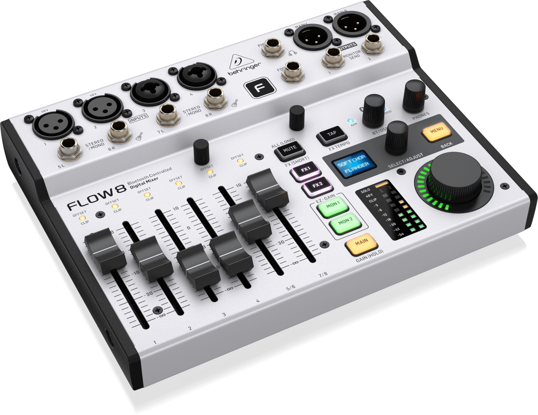 Відтоді як компактні акустичні системи зайняли домінуюче становище на споживчому ринку, Bluetooth утвердився як стандарт аудіоз'єднань у світі споживачів. Гнізда Mini-jack дедалі більше витісняються, а багато смартфонів і планшетів потребують спеціальних адаптерів для виведення аналогових аудіосигналів. Тому FLOW 8 пропонує вбудований Bluetooth-приймач, що дає змогу комфортно слухати музику в перервах між виступами без надокучливих адаптерів і необхідності постійно перебувати поруч із мікшерним пультом. BT-аудіоз'єднання для відтворення звуку може бути під'єднане незалежно від віддаленого додатка FLOW 8. При використанні BT Audio для відтворення на одному мобільному пристрої, BT LE може бути використаний окремо на іншому пристрої для додатка управління, якщо ви хочете.