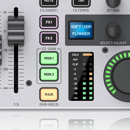 8-вхідний цифровий мікшер з Bluetooth Audio і управлінням додатками, 60 мм-канальними фейдерами, 2 FX-процесорами і USB/аудіоінтерфейсом.