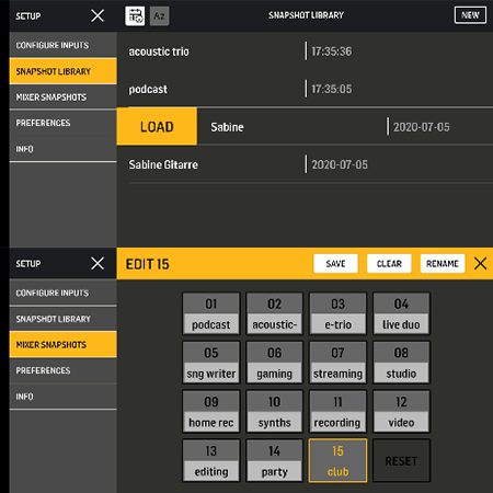 Записуєте подкаст в один день, а вокал - в інший? Мікшуєте кількох виконавців на одному концерті? FLOW 8 - ваш постійний супутник у різноманітних аудіозастосунках, де вам потрібен ідеально налаштований пресет, доступний на кінчиках пальців упродовж кількох секунд. Вбудована бібліотека знімків і можливість зберігати необмежену кількість знімків в одному застосунку FLOW 8 дають вам миттєву та необмежену владу. зберігайте, редагуйте та завантажуйте налаштування мікшера через обладнання або застосунок миттєво. Ви навіть можете запустити миттєве завантаження за допомогою під'єднаного футсвітча, щоб оживити ваш виступ. У застосунку FLOW Mix навіть є можливість запам'ятовування, щоб завантажити FX, Channel, Main, Monitor або Routing-Options окремо (потрібне прошивання 11739 або вище). Тоді як апаратне забезпечення забезпечує 15 внутрішніх слотів для зберігання пресетів миттєвих знімків, застосунок може зберігати необмежену бібліотеку знімків, відсортованих за ім'ям, датою і часом.