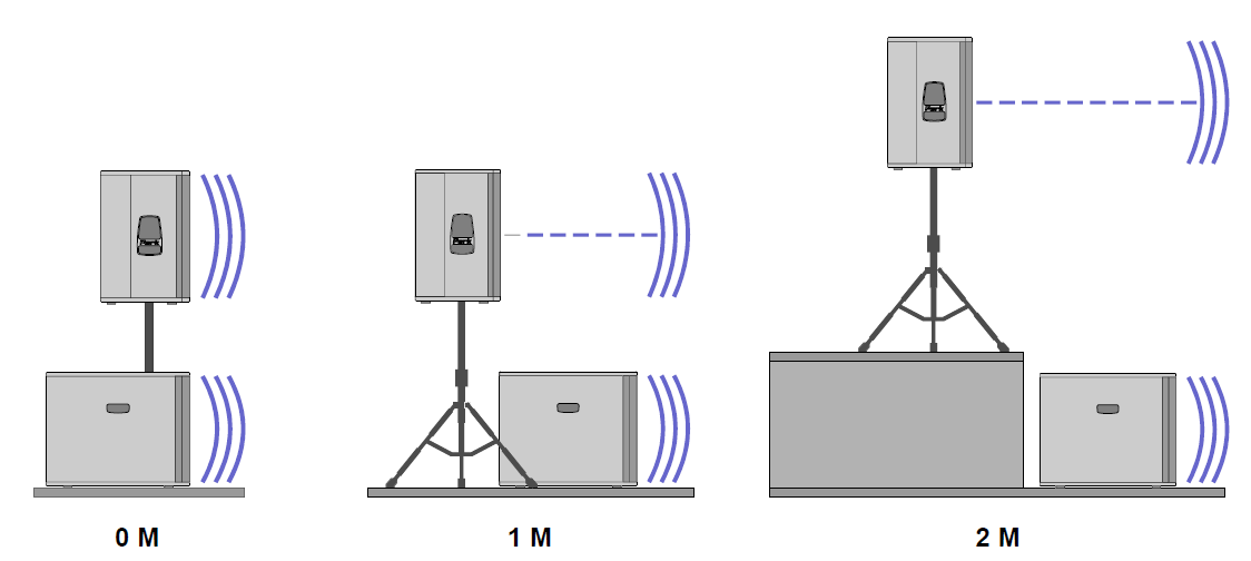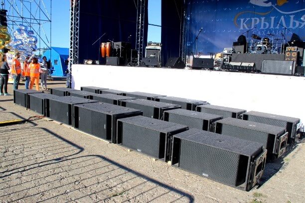 Опираясь на физические законы логично будет расположить сабвуферы на одной высоте с линейными массивами. Таким образом, у нас получится устранить задержки, выровнять АЧХ и убрать частотные искажения, но взамен придется пожертвовать эффективностью работы сабвуферов. Данный компромисс позволяет получить однородную звуковую картину в области частоты среза кроссовера.
