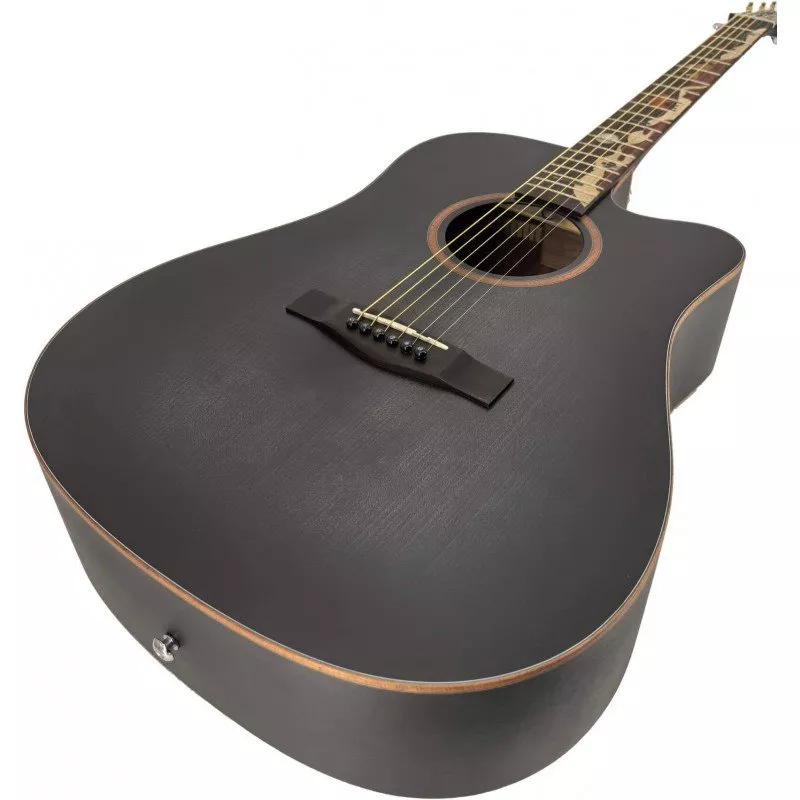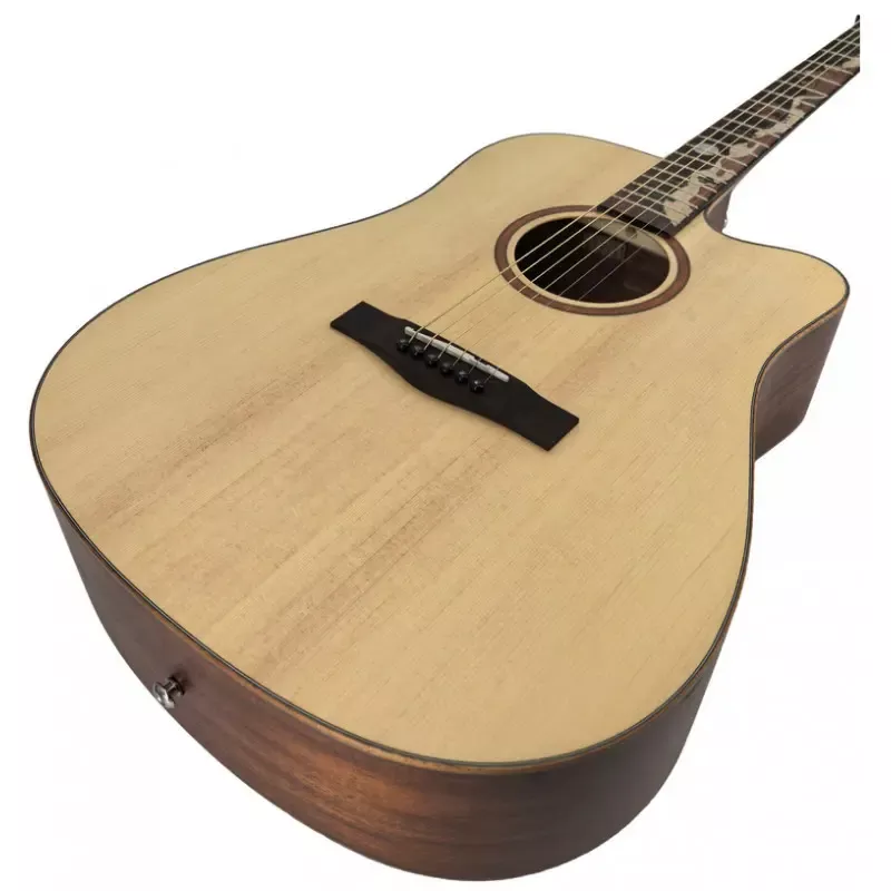 Корпус размером 41 дюйм создан для полного, мощного звучания с хорошим резонансом. Верхняя дека сочетает массив ели и махагони, даря баланс между звонкой четкостью и глубоким теплым тоном. Задняя часть и боковины из ламинированного махагони усиливают этот эффект, делая звук выразительным, но не агрессивным.