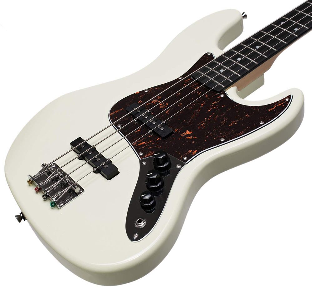Корпус бас-гитары Jay Turser JTB 402 выполнен в форме "джаз бас" цвета слоновой кости с глянцевым покрытием, изготовлен из массива ольхи. Кленовый гриф с болтовым креплением имеет палисандровую накладку и 21 лад. Инструмент имеет два сингловых звучка, которые имеют независимые регуляторы громкости и общий регулятор тон. Гитара подходит как для начинающего музыканта, так и для профессионального басиста.