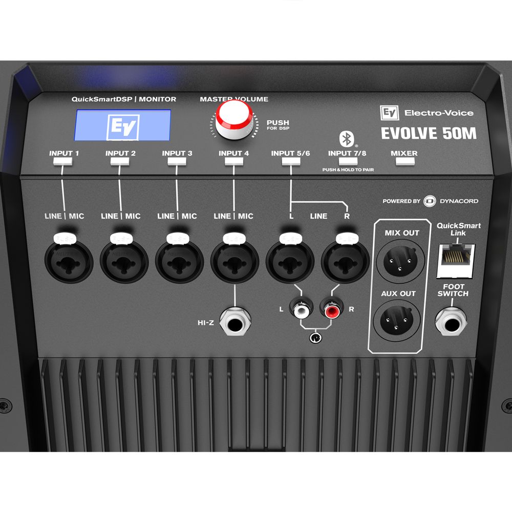 На сегодняшний день модель EVOLVE 50M оснащена самым современным набором наиболее полезных функций среди всех моделей своего класса на рынке, а буква "M" в названии модели обозначает полноценный свободно конфигурируемый 8-канальный цифровой микшер. Разработанный командой инженеров мирового уровня немецкого бренда Dynacord микшер имеет несколько входов с предусилителями и функциями профессионального уровня. Встроенный скоростной модуль Bluetooth® обеспечивает передачу аудио высокого разрешения в качестве плейбэка или аккомпанемента. Кроме того, в микшере имеются независимые aux посылы и возможность подключения педали, а большой выбор эффектов профессионального уровня (30 пресетов, в том числе хорус, дилей, фленджер и ревербератор на двух каналах эффектов) добавляют музыкантам множество вариантов для улучшения своего звука. Все вышеперечисленные функции позволяют в первую очередь избавиться от дополнительного оборудования, например, микшера и педалей эффектов, и множества проводов на сцене, а значит существенно снизить время на погрузку/разгрузку и установку/разборку системы.