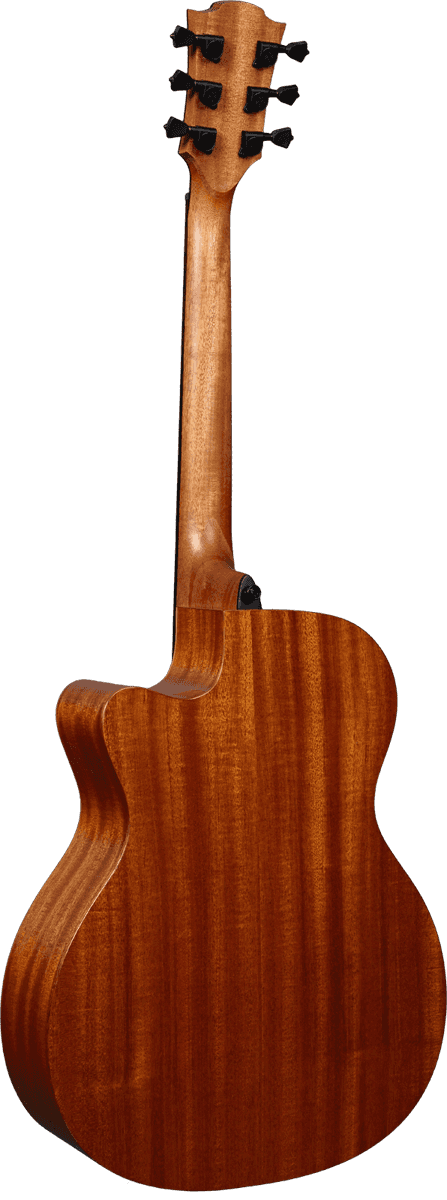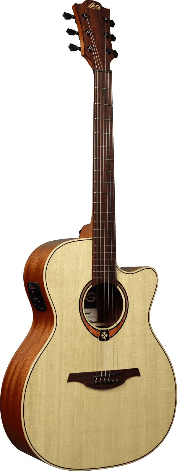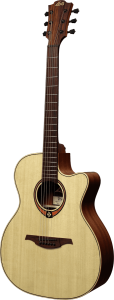Электроакустическая гитара формы аудиториум с вырезом. Нижняя дека, обечайки и гриф - из дерева Тропической Хайи, накладка на гриф и бридж из коричневой древесины (Браунвуд). Эта гитара имеет 20 ладов, графитовые верхний и нижний порожек. Механика - литая, черная, покрытие атласное. На гитару установлен предусилитель Stage-Lag.
