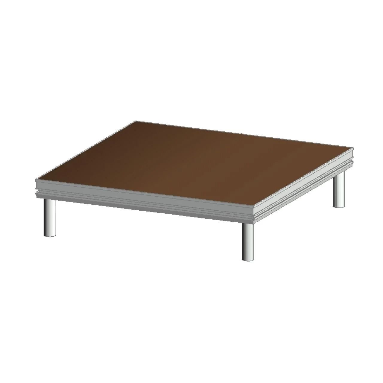 Данный модуль сценического подиума размером 1х1 м. является основой для создания сцен, трибун, VIP зон, подиумов под барабаны, подиумов для хора, театральных подмостков и других конструкций, где требуется оперативность, красивый внешний вид и высокая прочность. Каркас изготовлен из алюминиевого профиля, в котором закреплена влагостойкая, ламинированная фанера с протиовоскользящим покрытием. В углах каркаса находятся крепления ножек подиума. Ножки подиума предлагаются двух видов: с фиксированной длиной и телескопические. Данные модули подиума соединяются между собой специальными зажимами. Алюминиевый каркас подиума имеет снаружи по всему периметру паз, к которому можно прикрепить ткань, закрывающую подиум со всех сторон. Для придания конструкции необходимой жесткости в нее вмонитрован металлическоий профиль.