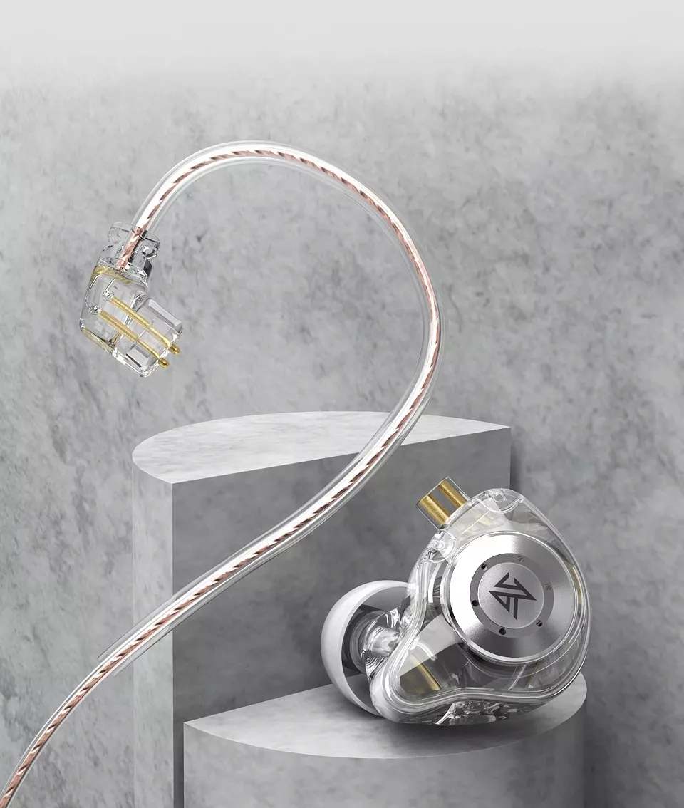 Внутренняя часть корпуса KZ EDX PRO MIC выполнена из полупрозрачного пластика, через который можно увидеть три динамика. На звуководе есть углубление для лучшего сцепления с амбушюрами и сетка для защиты от попадания пыли и грязи. На внешней стороне наушника расположена панель с небольшими отверстиями, которые сделаны для отсутствия ощущения давления. Корпуса наушников анатомической формы хорошо изолируют от внешнего шума. Удобная посадка и заушное крепление позволяет пользоваться KZ EDX PRO MIC во время пробежек и занятий спортом.