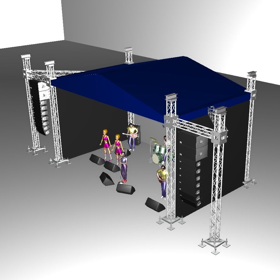 В комплект поставки входит алюминиевый каркас крыши, система растяжек, состоящая из тросов, спансетов и трещоток для натягивания тросов. Так же в комплектацию этой подъемной крыши включены: тент с системой растяжек, одежда сцены (задник и боковины) изготовленная из радио ткани, и система труб для натяжения тента.