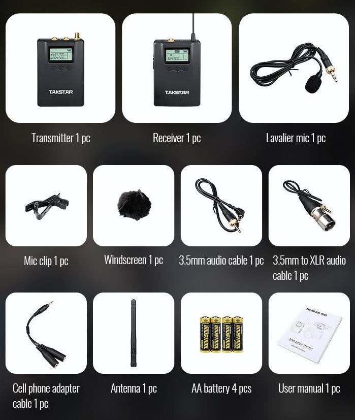 Takstar SGC-200W – компактная микрофонная радиосистема, преимущества которой оценятся множеством специалистов, работающих со звуком и/или видео. Состоит из приемника и передатчика, синхронизируемых по радиоканалу. Отличается прочной конструкцией, стабильностью работы и гуманным ценником. Поставляется в комплекте с расширенным набором аксессуаров, включая петличный микрофон.