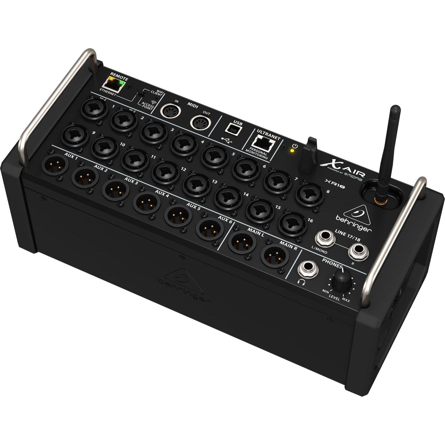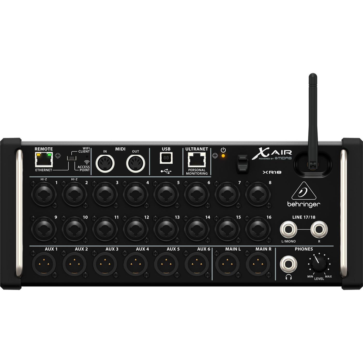 Behringer X Air XR18 – 18-канальный цифровой микшерный пульт/Stage-бокс для планшетов iPad/Android с 16 программируемыми предусилителями Midas, Wi-Fi модулем, многоканальным USB аудиоинтерфейсом и комплектом рэковых крепежей.