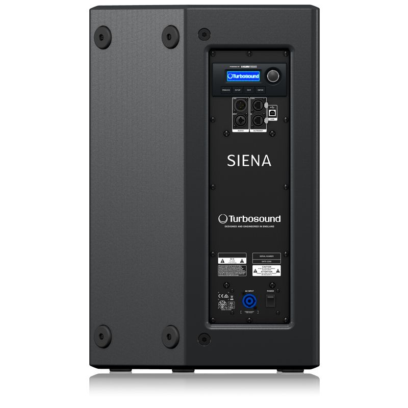 В TurbosoundSiena TSP122-AN используются усилительные модули KLARK-TEKNIK пиковой мощностью 2500 Вт (3000 Вт для сабвуфера) и встроенным DSP, который позволяет корректировать частотную характеристику, имеет блок подавления обратной связи FBQ, может обеспечивать задержку сигнала до 300 миллисекунд и его лимитирование. Кроме аналогового балансного входа, активные системы Turbosound Siena имеют цифровой вход формата ULTRANET, позволяющие получать цифровой сигнал непосредственно с микшеров Behringer и Midas. Для обеспечения надёжного контакта в цепи питания акустических систем, имеющих высокую мощность, применяется кабель с разъёмом powerCON.