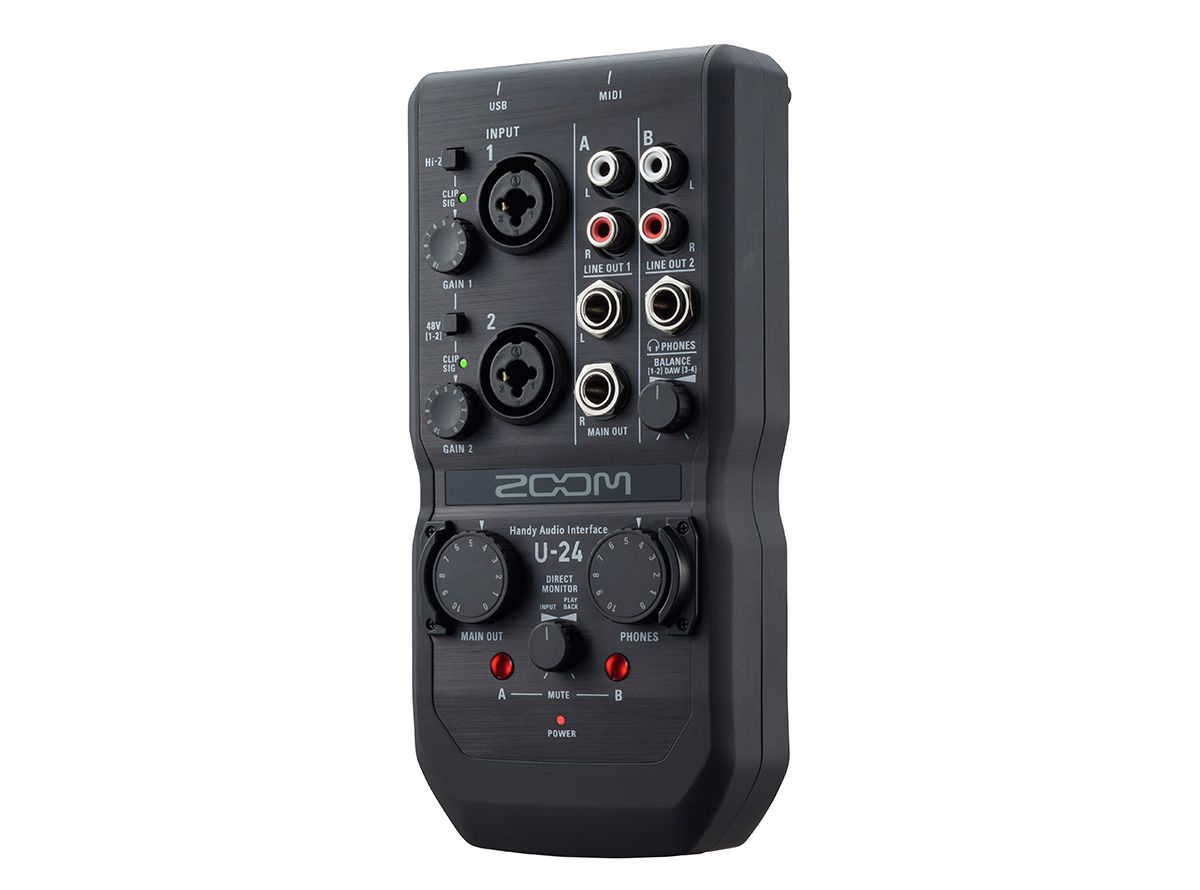 U-24 – это компактный аудиоинтерфейс с двумя входами и четырьмя выходами, который предоставит вам все необходимые средства для записи и воспроизведения аудио высокого качества. Данная модель совместима с с PC, Mac и iOS-устройствами и может работать от батареек а благодаря компактным размерам его можно взять с собой куда угодно. Даже не смотря на свои размеры и портативность Zoom U-24 предоставит вам запись звука высочайшего качества благодаря высококачественными бесшумными предусилителями. Так же Zoom U-24 можно использовать в качестве усилителя для студийных наушников. 2 комбо-входа с независимыми ручками управления усилением и цветными индикаторами уровня позволят подключить микрофоны, клавиши, микшерные пульты и многое другое. Оба входа имеют фантомное питание (48В), а первый вход поддерживает Hi-Z импедансы для подключения гитар, бас-гитар и других пассивных инструментов. MIDI-вход и выход позволят использовать такие устройства, как клавиатуры, контроллеры, синтезаторы и драм-машины. Отдельные TRS и RCA выходы открывают несколько вариантов для подключения DJ-микшеров, мониторов и другого оборудования. А независимый выход для наушников с собственным регулятором громкости предоставит дополнительную гибкость при мониторинге во время записи.